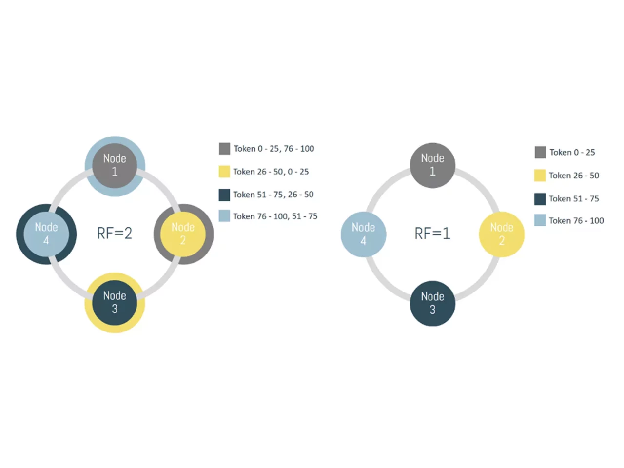 Cassandra has a flexible replication factor, so the second image explains what would happen if we chose to duplicate data by factor 2. Now the same data can be found on 2 nodes. Image 1 is obviously not a realistic scenario. What if a node goes down? Your data might be inaccessible or worse, lost. Always build your systems for failure.