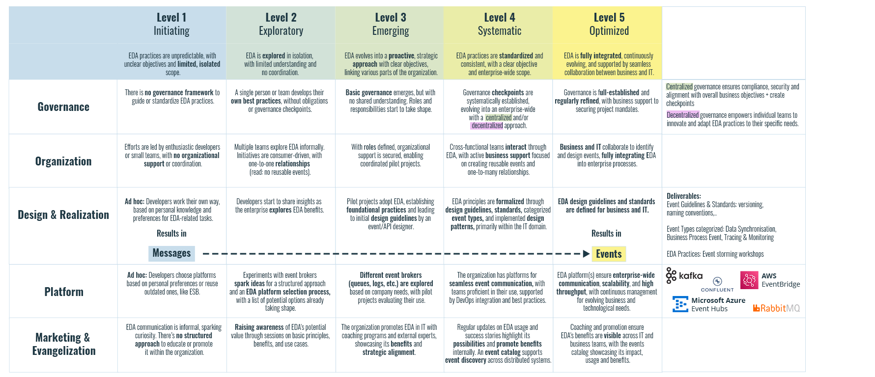 The EDA Maturity Model is designed to assist our customers and consultants in understanding which EDA maturity level aligns best with the current and future needs of the organization.