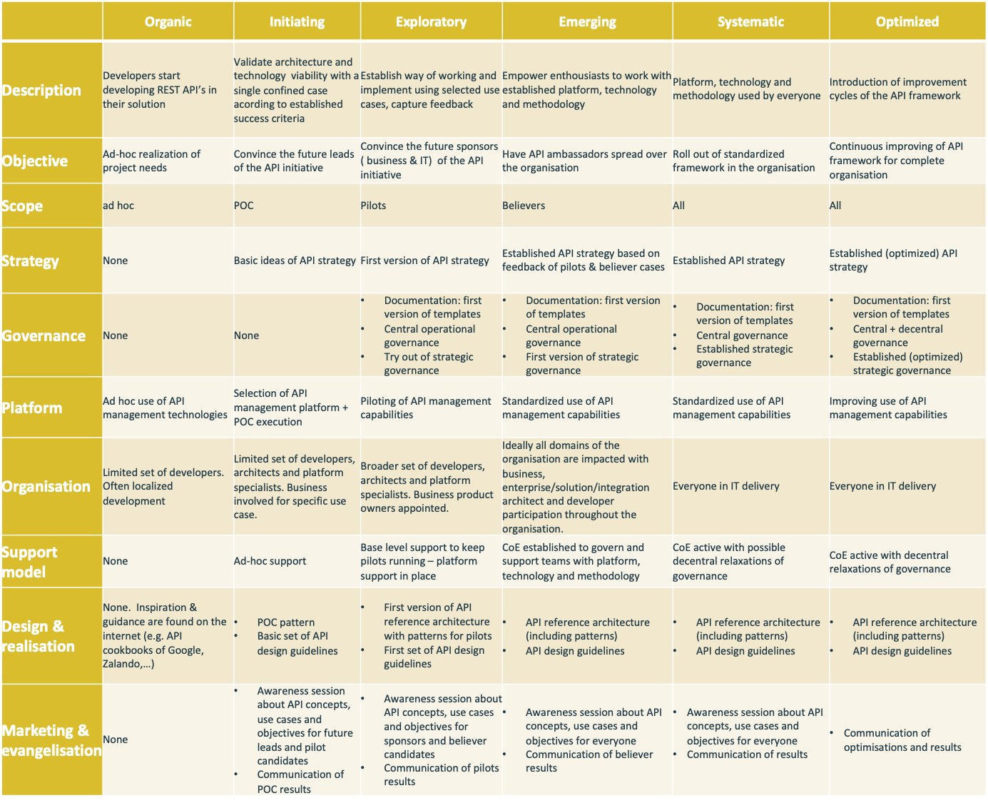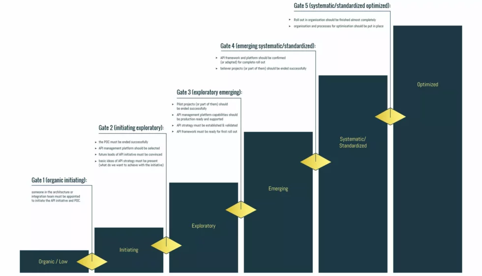 - Optimized: the API initiative and framework needs to be improved continuously. This stage embeds the continuous improving and learning cycle.