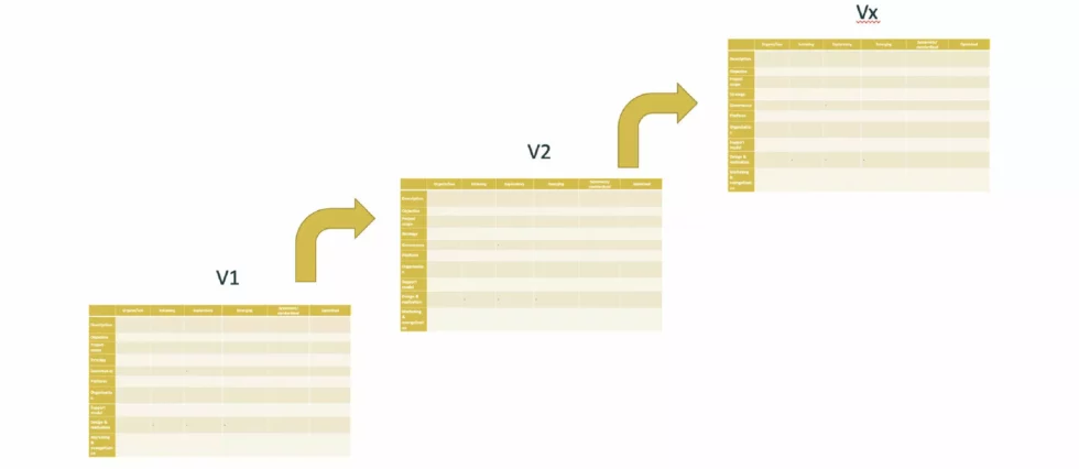 In the final stage of the maturity model, the focus is on improvement. Implementing further optimisations of the established framework in the standardized stage. When an organization wants to introduce a big improvement or change, this will not be enough. You need to retake some of the stages again. For example if your strategy changes from internal to public, your framework and platform should be revised. In this case you better start your maturity journey again from initiating stage.