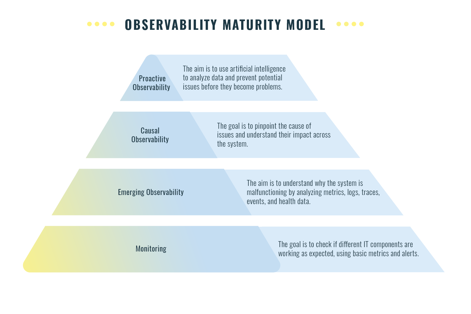 Observability is a game-changing factor in the field of IT operations, as it goes beyond traditional monitoring, offering profound insights into complex systems. The Observability Maturity Model presents four progressively advanced levels, each building on the preceding one to enhance data capture, analysis, and understanding.