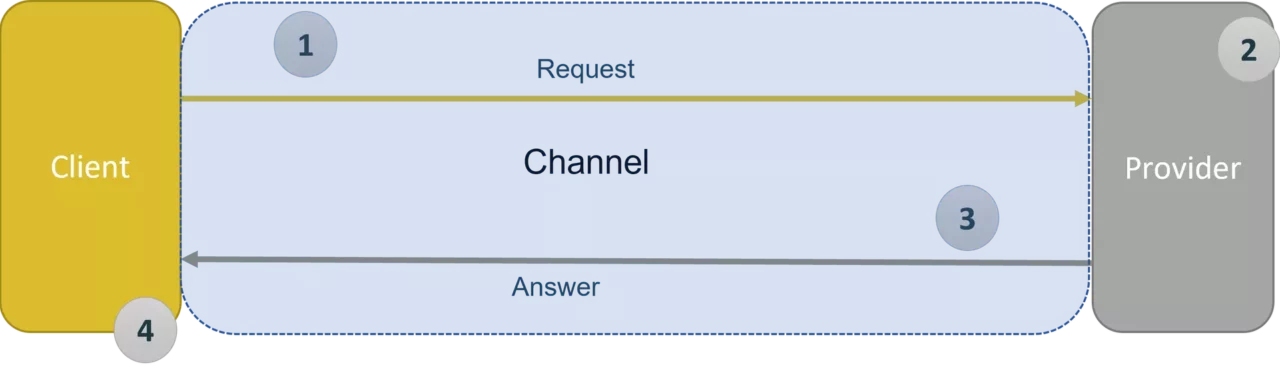 The communication typically starts when a client (the party needing the information) sends out a request to the provider (the party that has the information). The provider receives the request, processes it immediately and sends back his answer.