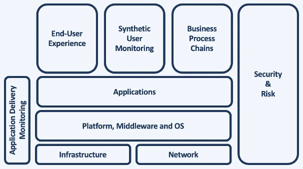 What we see with customers is a clear pattern. In early maturity, teams focus on the basics: infrastructure and application health. As maturity grows, the focus shifts outward to the layers where decisions and risk live. That is where security and risk management, end user experience, and business process chains come into focus.