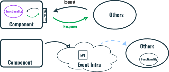 Some might argue that the event itself contains the API or behavior. For example, data events could carry information about whether an object was created, modified etc. While this is true, it’s not behavior-it’s state. This state allows others to act accordingly. It is the other system that modifies its behavior based on the state it receives.