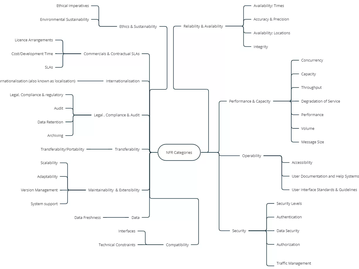 As mentioned in the previous paragraph, obtaining information about non-functional requirements can be challenging, but is absolutely necessary. One useful approach is to use an overview of non-functional requirements categories, such as an NFR category mindmap to ensure that no important requirements are overlooked. While not all categories will always be applicable, having an overview of potential NFRs can help in selecting those needed for a specific solution.