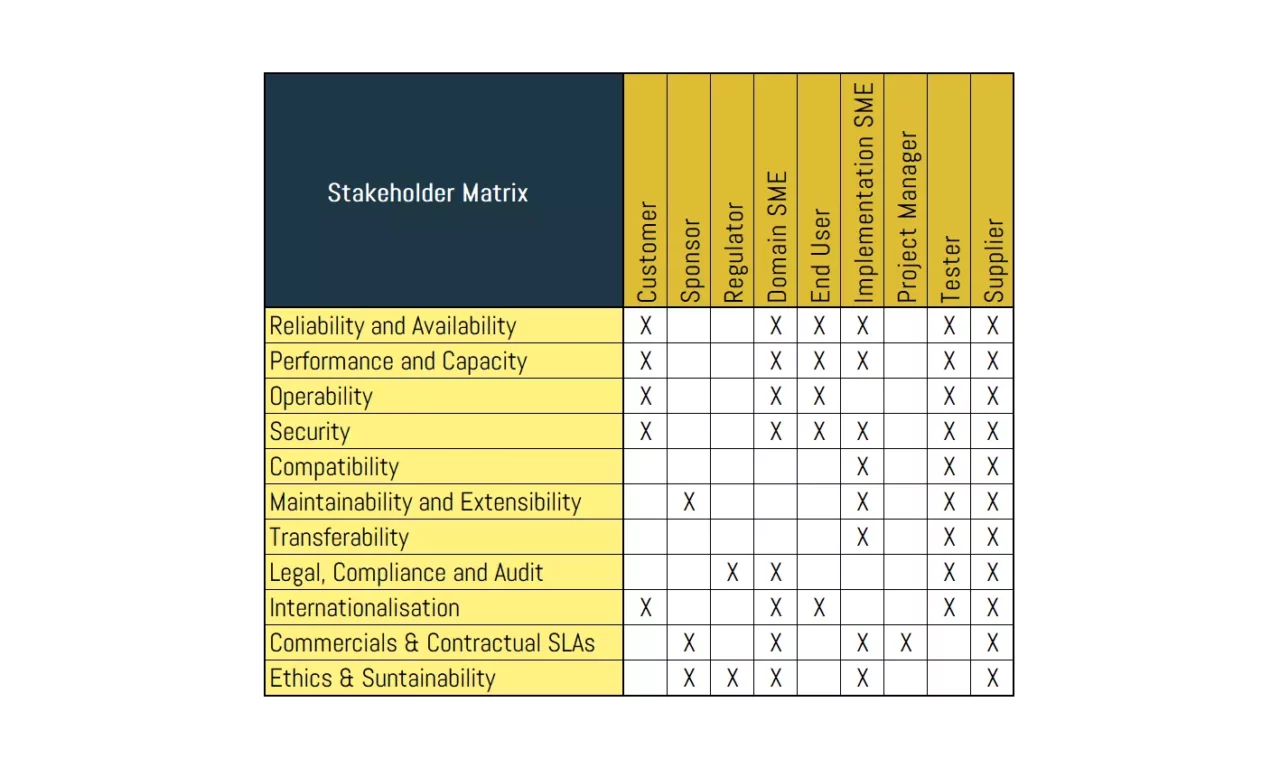 Another technique that can be used to ensure comprehensive coverage of all non-functional requirements (NFRs) and stakeholders is the Stakeholder Matrix. This tool provides a structured overview of the NFR categories that require information gathering and the relevant stakeholders that should be involved. This approach offers a clear overview of the link between the different stakeholders and NFRs, which enables identification of any potential gaps in NFR coverage.