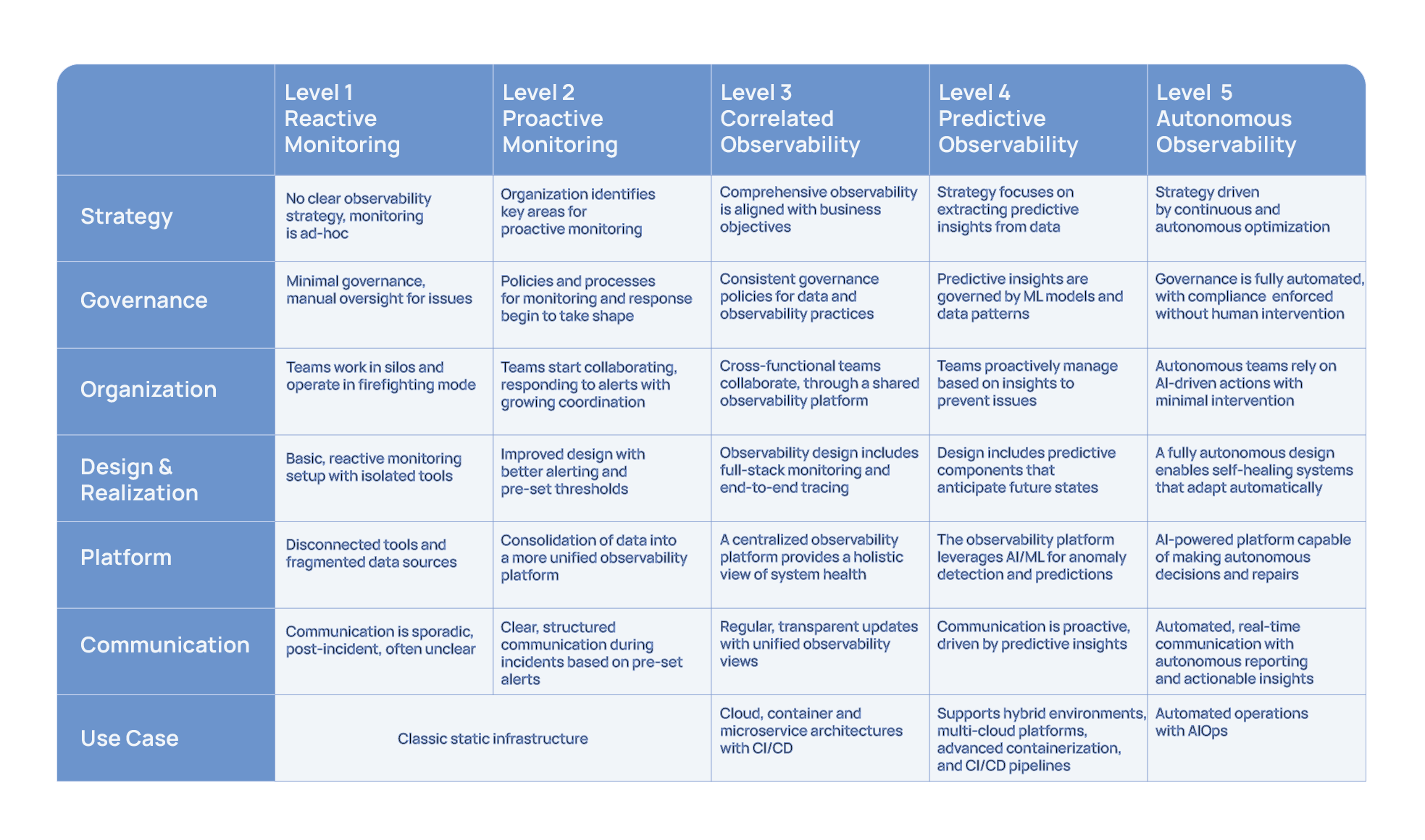 Think of this model as a grid with an X and Y axis. The X-axis represents levels – from 1 to 5 – showing an organization’s maturity stage. The Y-axis evaluates observability maturity across five key dimensions.